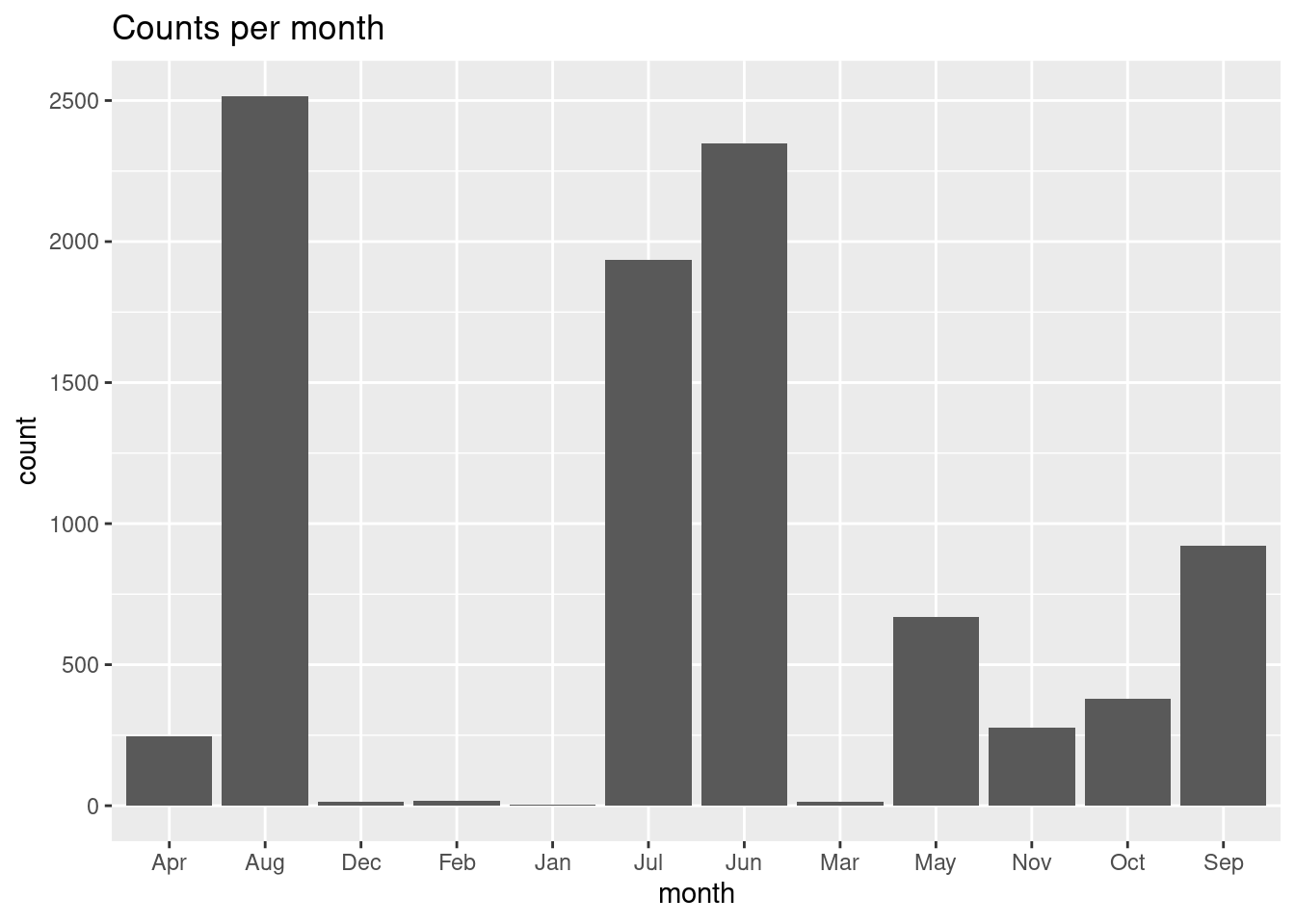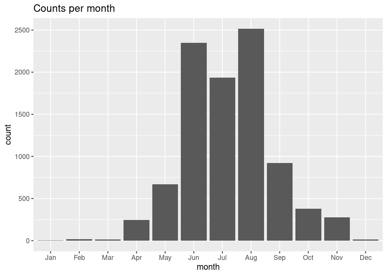 We will be making models and predictions for each month of the for the 4 future projection climates. Species and observers do show some seasonality, but it that seasonality so extreme that it might be impossible to model some months because of sparse data? Let’s make a plot of the counts per month.