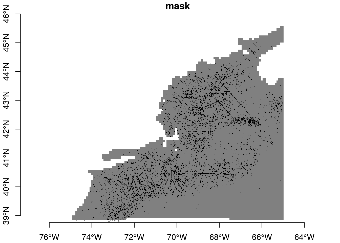 Last, but certainly not least, we should consider the possibility that some observations might be on shore. It happens! We already know that some records included fish that were washed up on shore. It’s possible someone mis-keyed the longitude or latitude when entering the vaklues into the database. It’s alos possible that some observations fall just outside the areas where the Brickman data has values. To look for these points, we’ll load the Brickman mask (defines land vs water. Well, really it defines data vs no-data), and use that for further filtering.