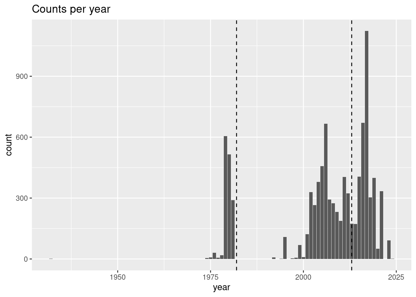 We know that the “current” climate scenario for the Brickman model data define “current” as the 1982-2013 window. It’s just an average, and if you have values from 1970 to the current year, you probably are safe in including them. But do your observations fall into those years? Let’s make a plot of the counts per year, with dashed lines shown the Brickman “current” cliamtology period.