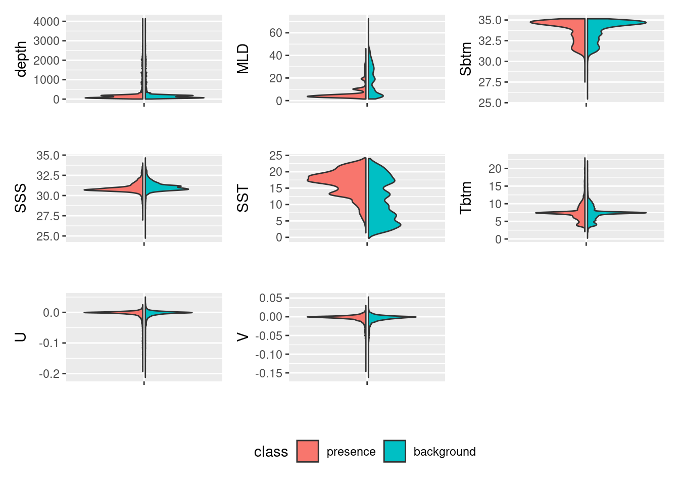 We are going to call a plotting function, plot_pres_vs_bg(), that wants some of the data from model_input and some of the data in variables. So, we have to do some data wrangling to combine those; we’ll add class to variables and then drop the .id column.