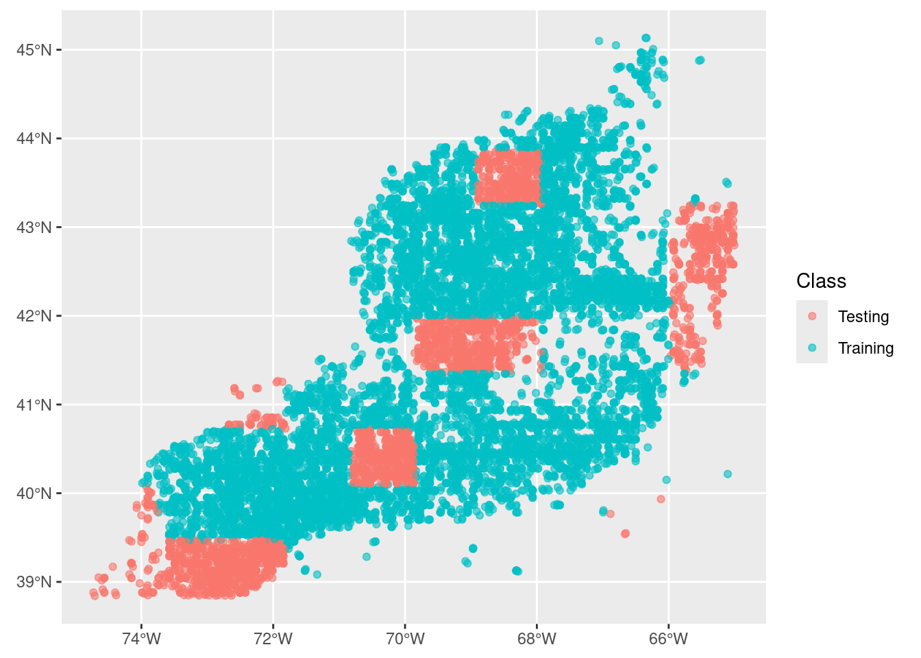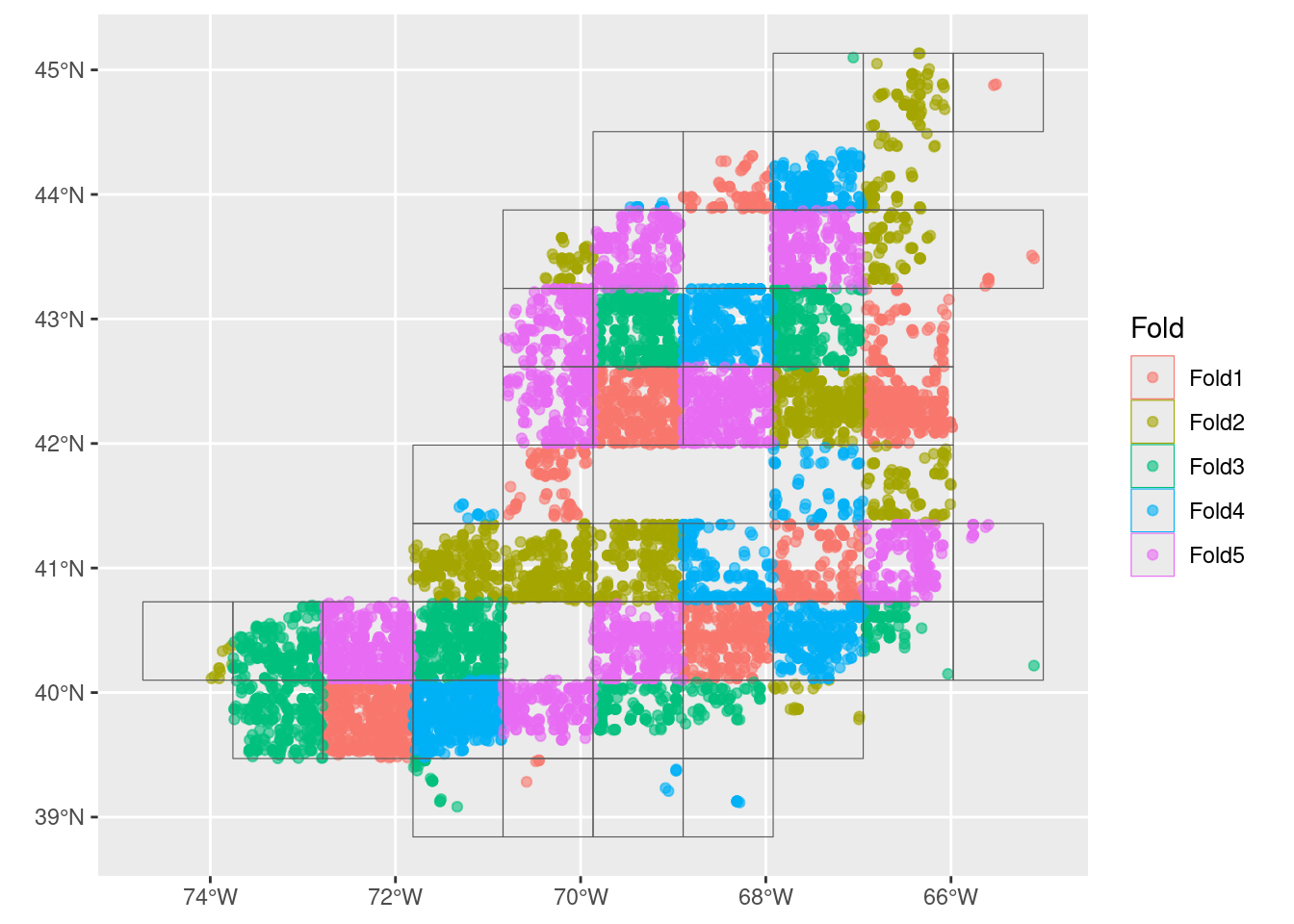 Next we take just the training data and split that into a set cross-validation folds. We do this to improve our model by making multiple spatially distributed training mini-datasets.