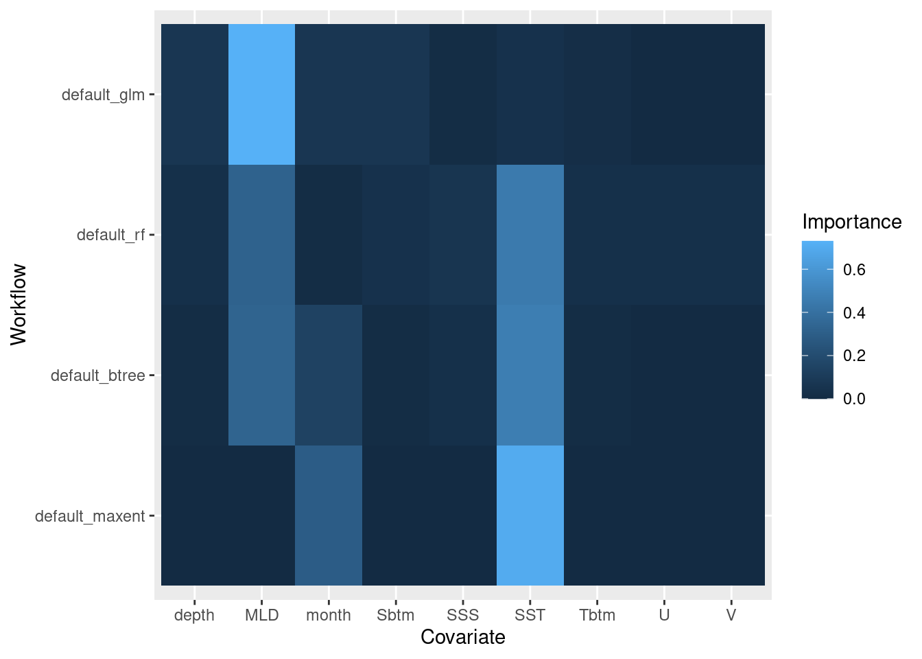 Variable importance can tell us about the contribution each covariate variable makes toward the whole. It doesn’t compare between models, just within a given model. Reading the heatmap below scans a given model’s row. For instance, MLD and SST seem to have high importance for default_btree (random forest) compared to the other covariates.