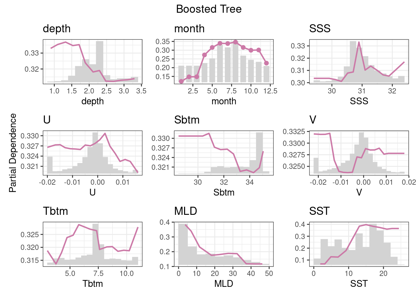 Partial dependence reflects the relative contribution of each variable influence over it’s full range of values. The output is a grid grid of plots showing the relative distribution of the variable (bars) as well as the relative influence of the variable (line).