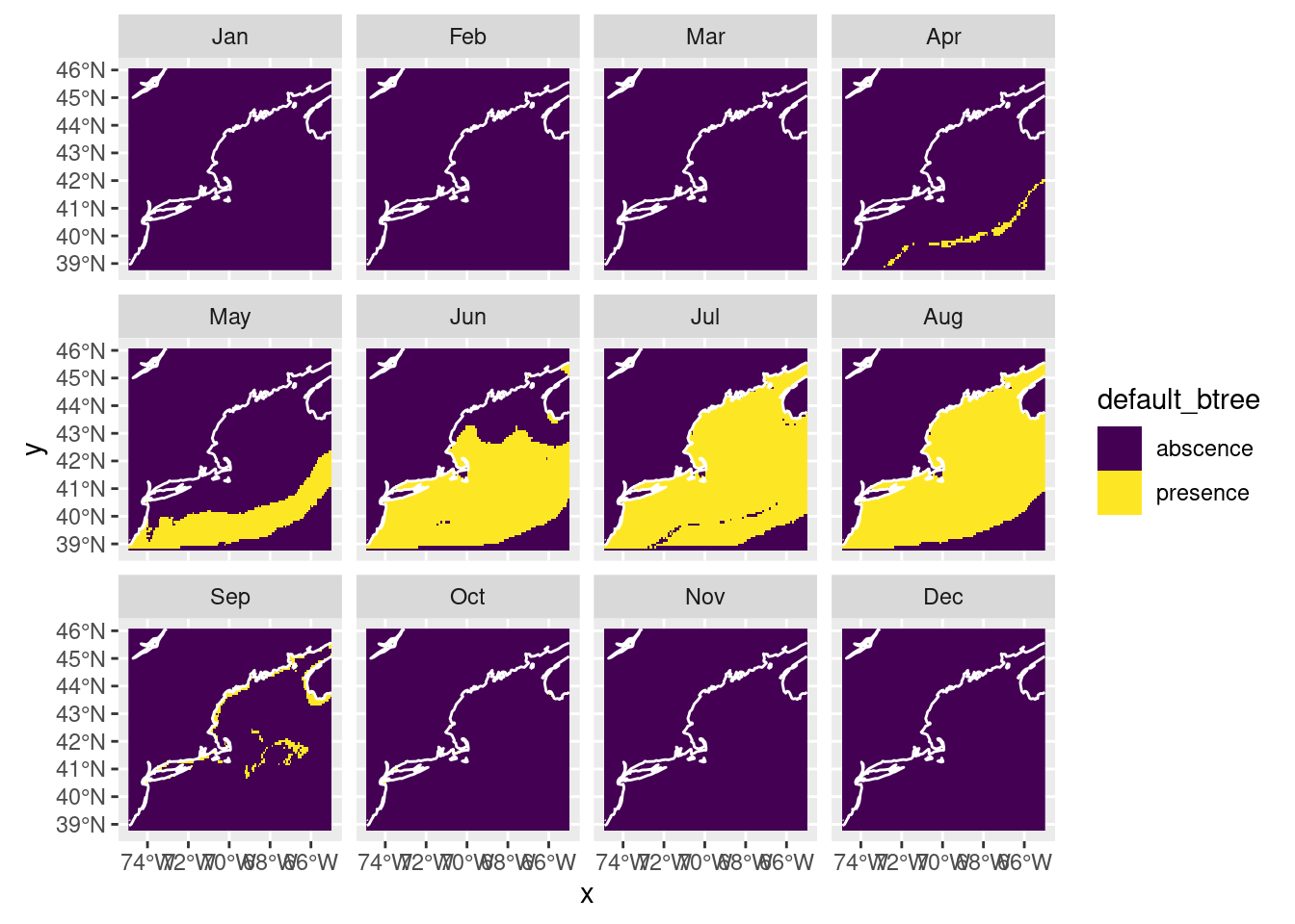 We can also plot a presence/absence labeled map, but keep in mind it is just a thresholded version of the above where “presence” means prediction >= 0.5. Of course, you can select other values to threshold the habitat suitablility scores.